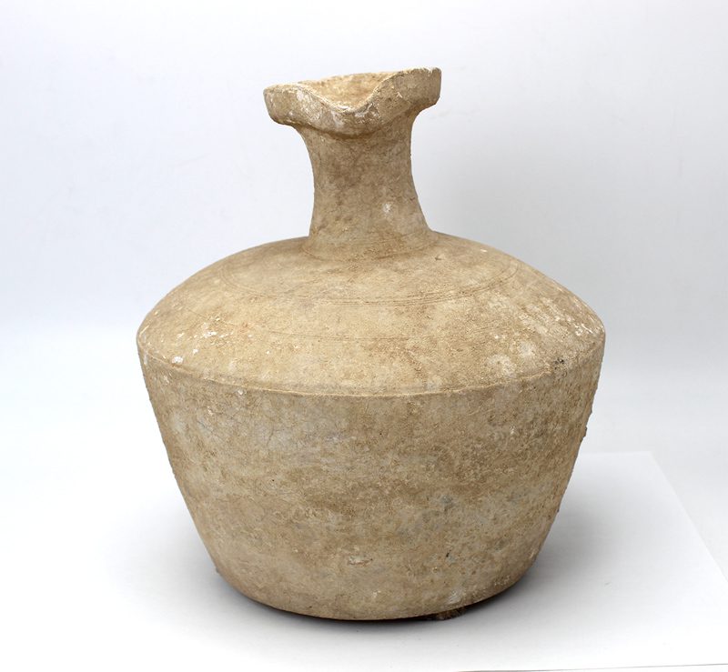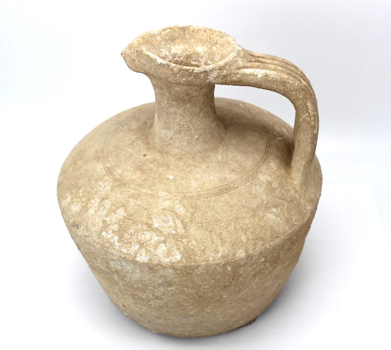 This is an excellent example of an ancient earthenware carinated pottery flagon made in production centers in throughout the Roman Empire. This was made in, the Roman-North-Africa territory called Africa-Proconsularis. These pouring vessels locally made by provincial artisans were used specifically to hold and pour water, wine and other liquids and placed in kitchens, on tables, at work places, etc.. “Flagon” is derived from the same Greek origin as the word for flask, but this is a larger variant of the Greek lagynos used mostly for oil. Classified as Coarse Wares, flagons were functional items made for the lower classes and were usually covered with a white or beige slip to enhance their appearance and lessen their porousness. Sometimes having a trefoil spout, they hydrated everyone including laborers, field workers, ship rowers and army personnel. They were also used at Roman household shrines to make offerings to the family’s domestic deities. Expected age markers include minor scrapes, slip losses, a chip, earth and mineral adherants and white deposits underneath. Otherwise, it is in excellent condition for its long burial and is without cracks, repairs, or restorations.
