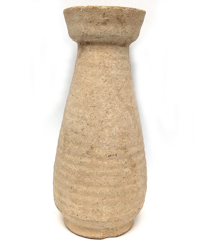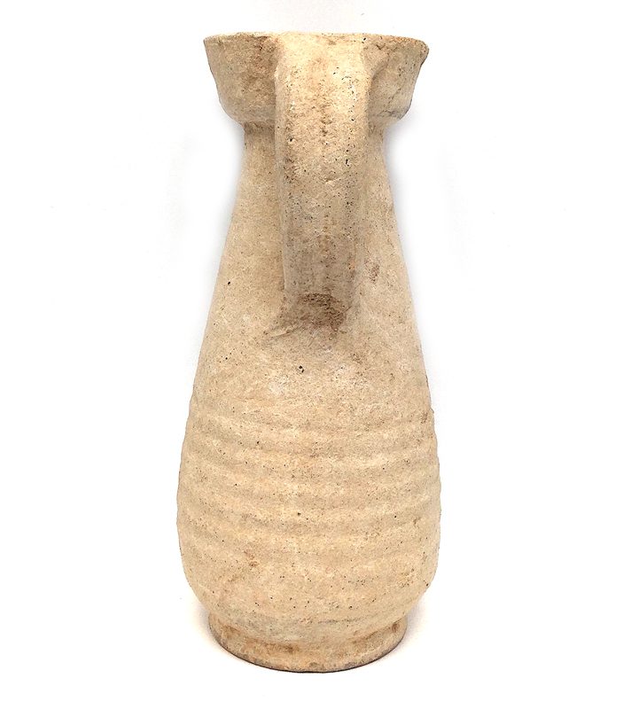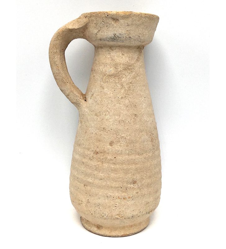 An oenochoe or oinochoe is the Greek word for a wine jug and the name of an important category of Greek pottery created in many forms of which there are many variants copied and modified by cultures throughout the ancient world, especially by ancient pottery centers in the Africa Proconsularis province of Roman North Africa. As common folk throughout the Roman Empire and elsewhere could only afford practical objects that were functional and without frills, potters created attractive yet useful every-day objects called Roman coarse wares using the most practical, inexpensive and long-lasting materials. This earthenware jug is elegant in its simplicity, undecorated except for horizontal ridges, curved single handle at its back, simple rim at the mouth and crème clay slip. Handles these items were made for comfort in handling, pouring and use by a single hand. Created with heavy and thick walls for durability, its wide curved strap handle has a mid decorative depression. The crème clay slip has naturally darkened and there is a slight chip on its foot and minor dings on its body, but it is otherwise in very good condition.