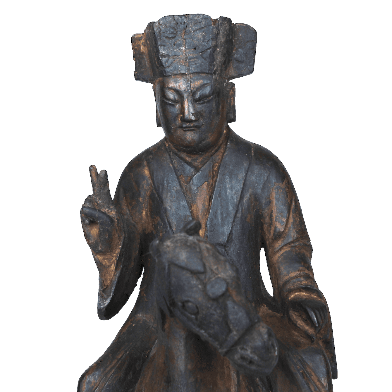 This fine carving is a Taoist priest in official’s attire astride a lively horse. Taoist priests and masters, viewed as models of morality protecting devotees by casting out demonic or malevolent spirits, were often depicted on horses reflecting the Way of the Tao that stresses harmony and oneness with nature and the elegance of nature personified by horses.
