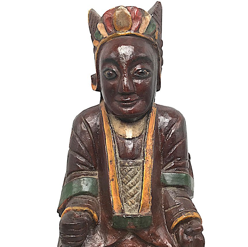 Either a Taoist house deity/dignitary or an ancestor figure, this colorful provincial carving has painted calligraphy identifying his name. The image has characteristics of Guandi, the God of War holding a tael or a military seal with military maille.