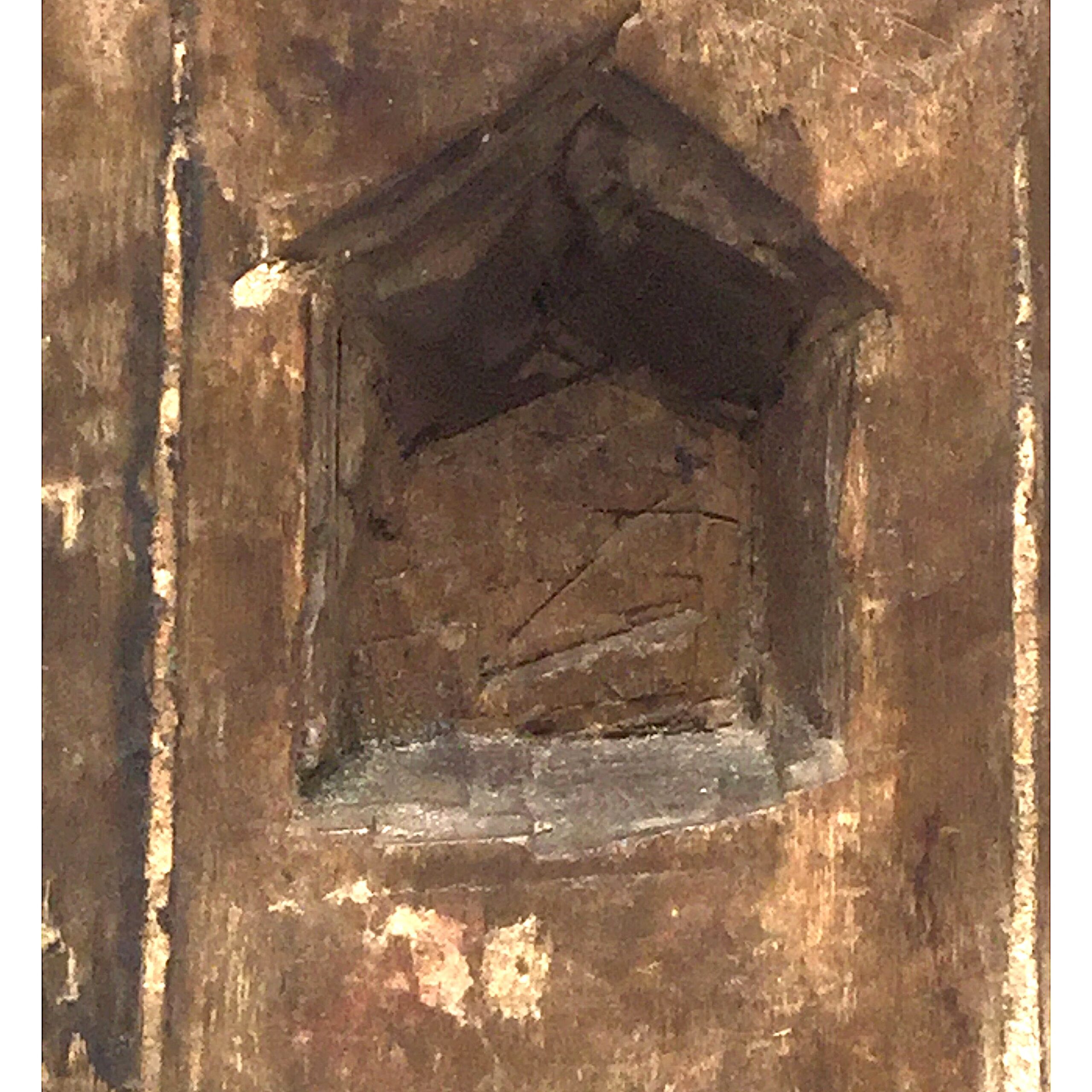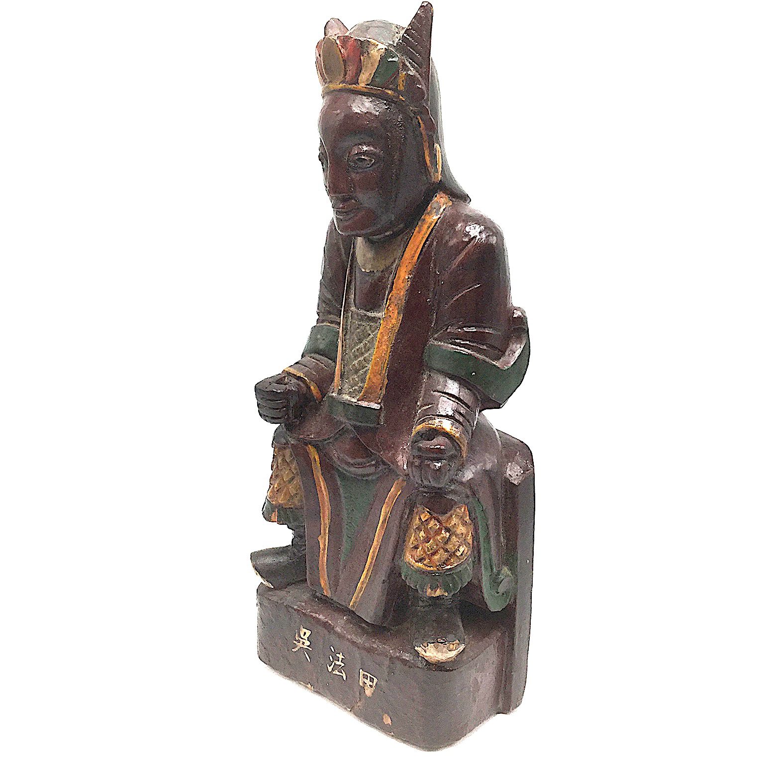 This colorful carving is either a Taoist house deity/dignitary or an ancestor figure. The calligraphy painted on the base names him “吳法甲” (Wu Fajia) presumably the ancestor to whom the statue is dedicated. Provincial carvers occasionally created their own versions of deified figures by merging characteristics from several gods into a single figure. This image has characteristics of Guandi, the God of War a popular figure in Chinese folk religion, Taoism, Confucianism, and Buddhism. Seated on a high backless chair, hands on the knees, one holds a small object like a tael (symbol of wealth) or a military seal, the other is poised to hold a sword, and he wears military maille at the chest and knees.