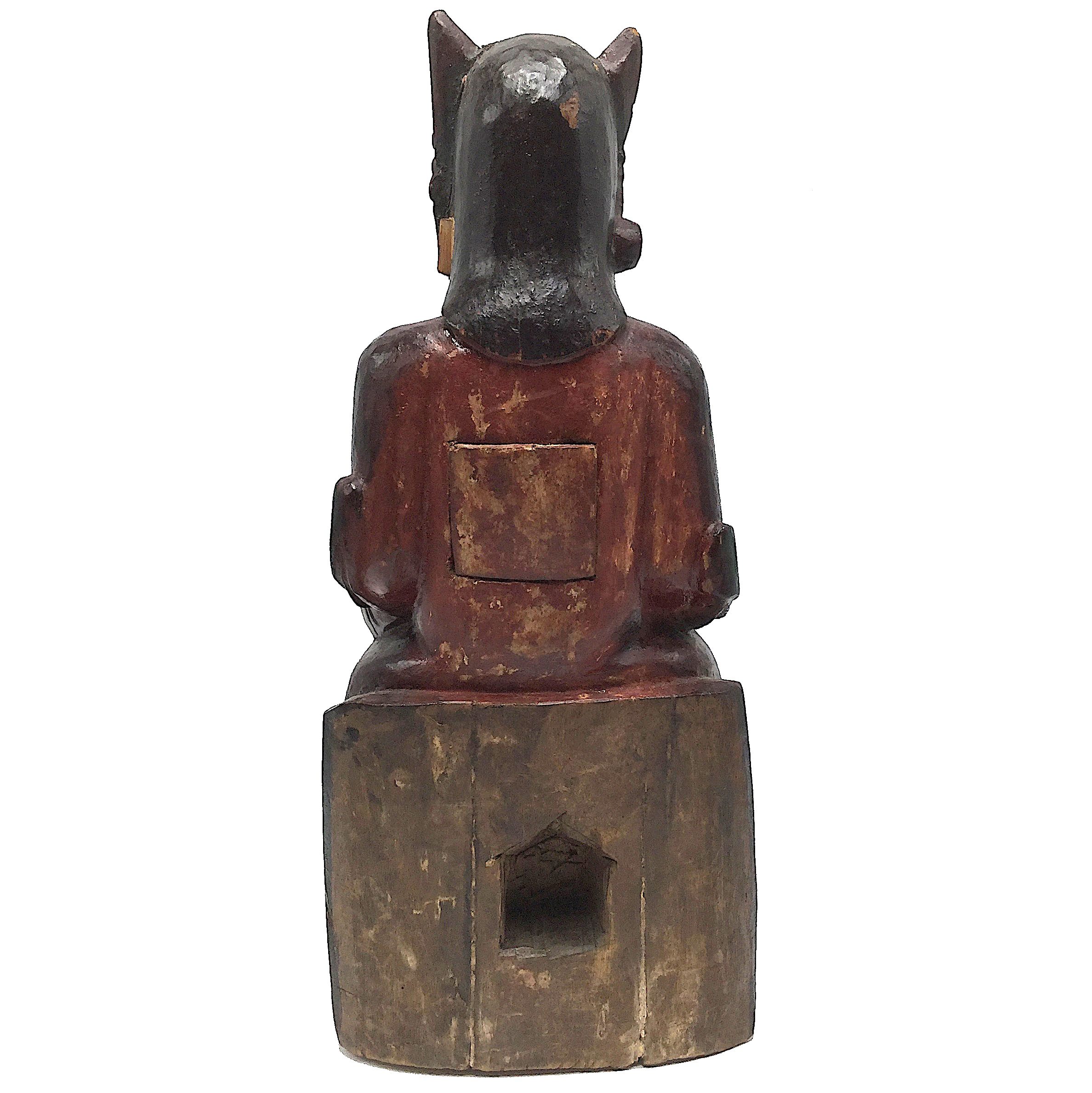 The piece is unique as it has two rear carved cavities to hold consecration slips or ritual items in an eye-opening ceremony by a Taoist priest. The upper rectangular cavity is sealed with a cover bung, while the lower one is open with a pitched tops shaped like a temple. The wood statue is finished with polychrome paint and lacquer, some of which has worn away over time and is in excellent condition