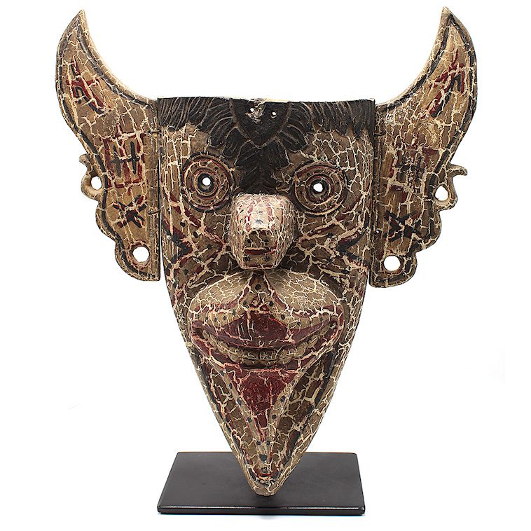 Dyak tribal masks known as hudoq are made in many variations and styles depending on the group crafting them. Named after the agricultural festival celebrated in Kalimantan, hudoq means harmful crop pests believed to be removed from fields during fertility rituals to protect rice fields and dispel malevolent spirits, pests and harmful entities. This vintage mask is authentic and traditional but less elaborate than antique hudoq that are more decorative with bright colors. Like many hudoq, it has separately carved wing-like ears tied to the central piece with rattan that is now replaced. The exposed recessed gnashing teeth are traditional. Although antique pieces have vibrant colors, fangs and dangling attachments the colors here are muted and subtle. The carving and decorative painting are finely executed and more restrained. The long triangular nose, curved slit eyes, rectangular recessed mouth with clenched teeth, undulating snake-like elements on the wings and the fine painted decorations on the winged ears and top of the head are outstanding. This mask was personally collected in the mid 1970s in Bali. There are many reproductions and masks referred to as antiqu baru meaning “new antique” but authentic vintage masks like this are now scarce. This piece is in good condition with no restoration or repairs except for the replaced rattan.
