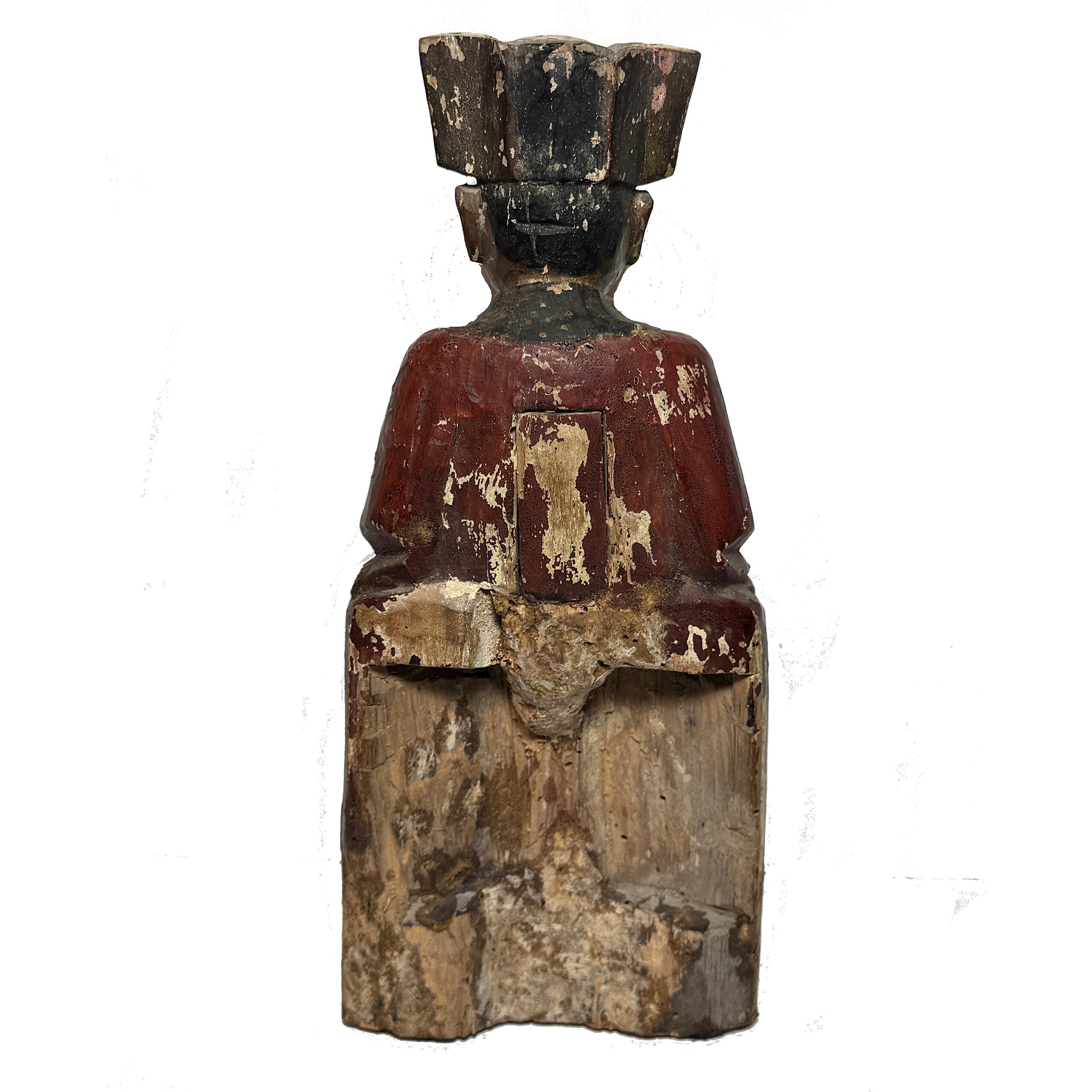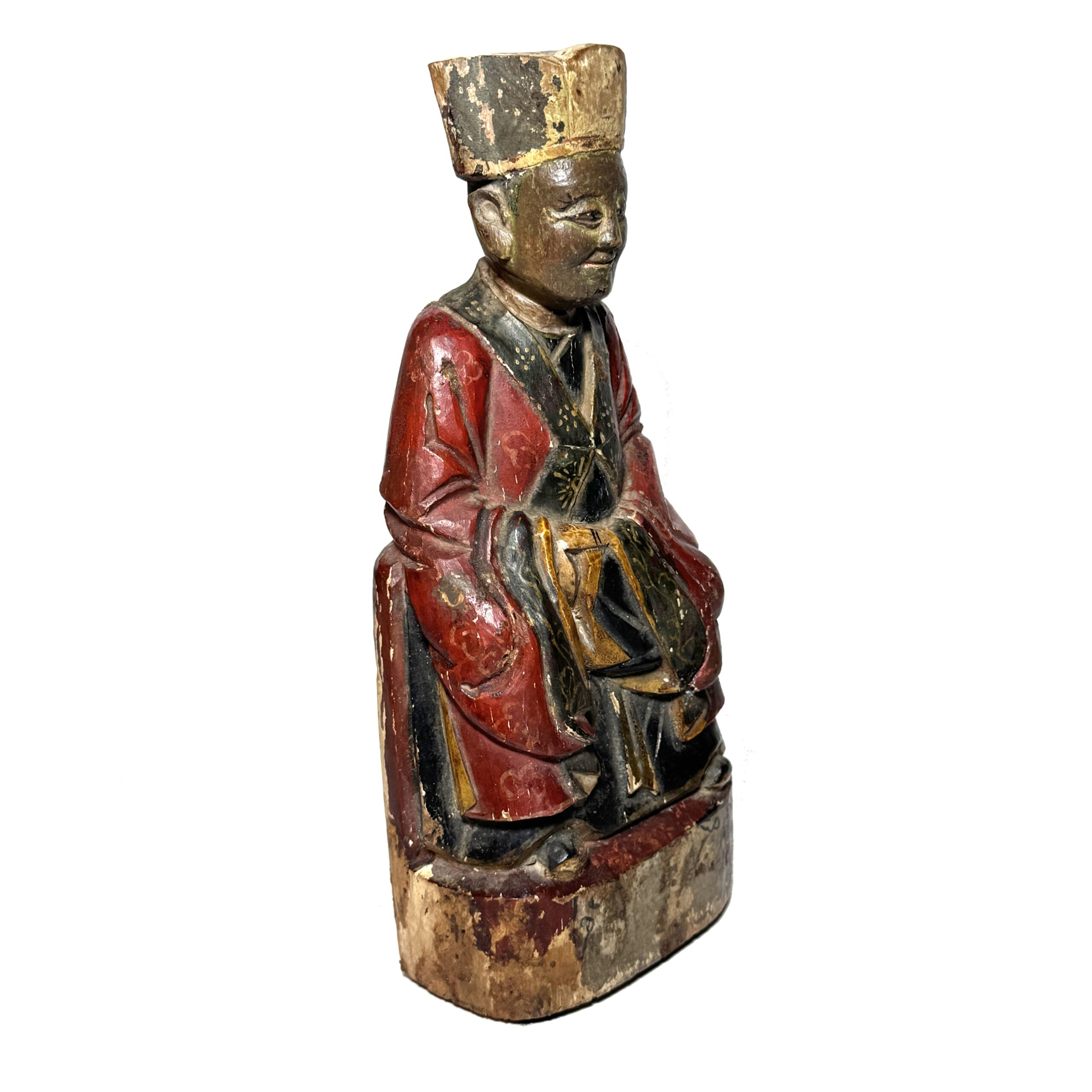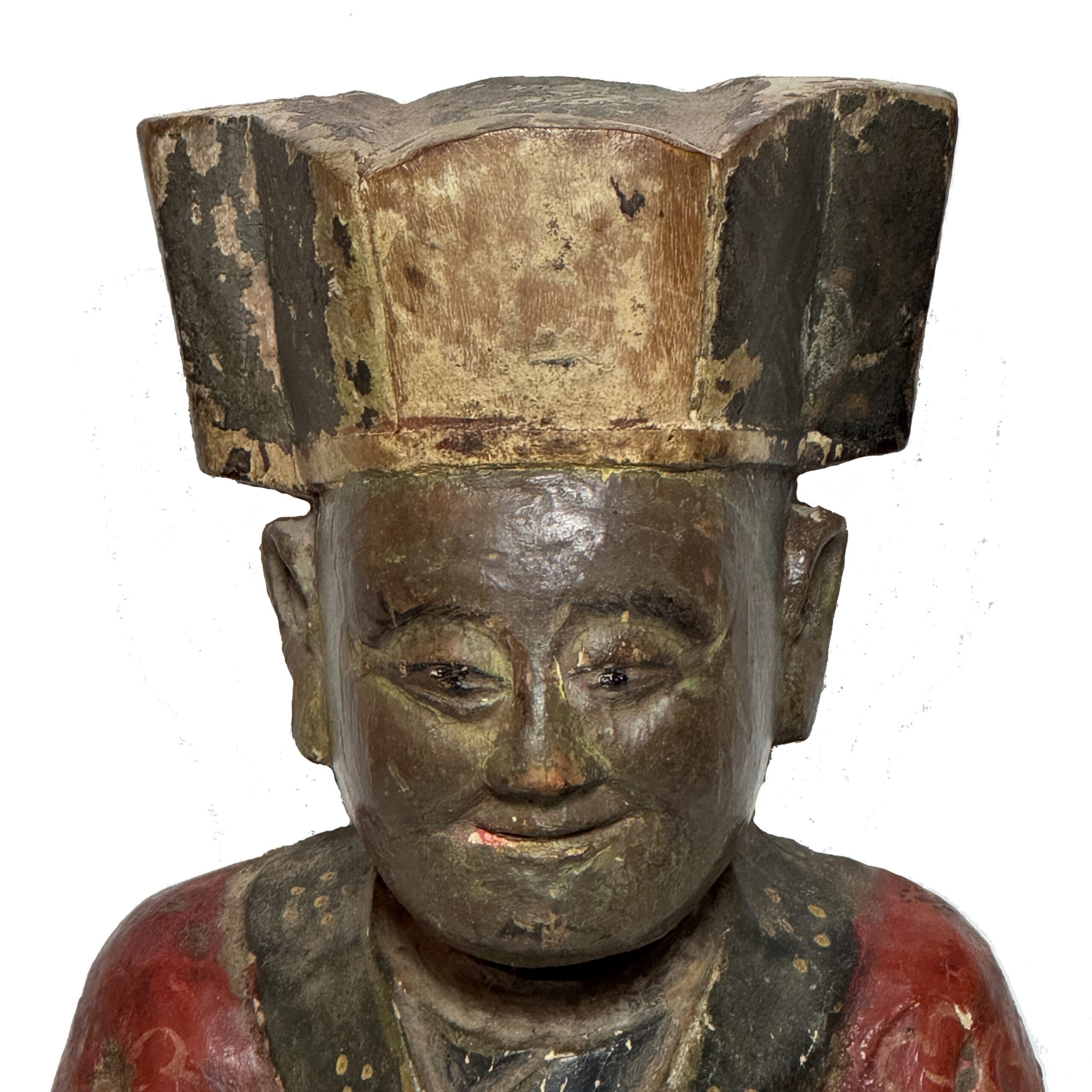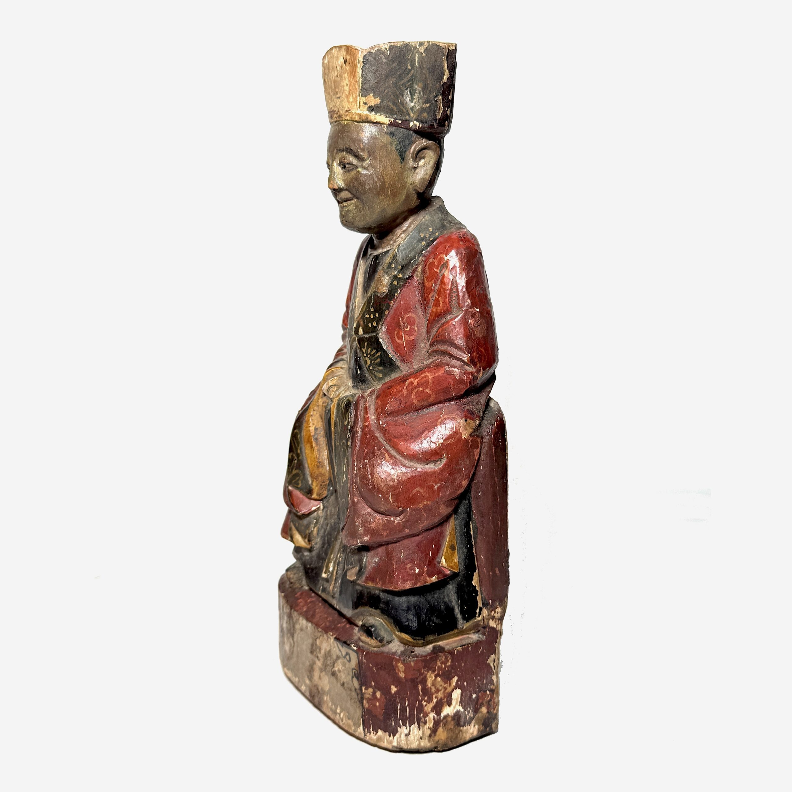 His beautifully carved face reflects his advanced age and high status. Almond-shaped eyes framed by carved arched eyebrows and thin lips with red pigment form a gentle, benevolent smile as if embracing all around him. The serene, smiling expression and downcast eyes incorporate Buddhist and Taoist artistic traditions and instill a feeling of spirituality and other worldliness. He wears the lavish attire of high-ranking Qing officials. His formal, layered robes in deep red and black are decorated with golden floral or cloud motifs on a high-collared, wide-sleeved garment, all signifying high status and esteem. Floral motifs were commonly used for Taoist or scholar-official deities symbolizing divinity and immortality. The flat-topped flared cap is a variant of a scholar–official’s hat, a primary symbol of imperial rank, authority, moral integrity, and seniority in the imperial hierarchy. Worn only by those above the scholar rank, it symbolized loyalty and unquestioning service to the emperor as well as Confucian principles of balance and social structure.
