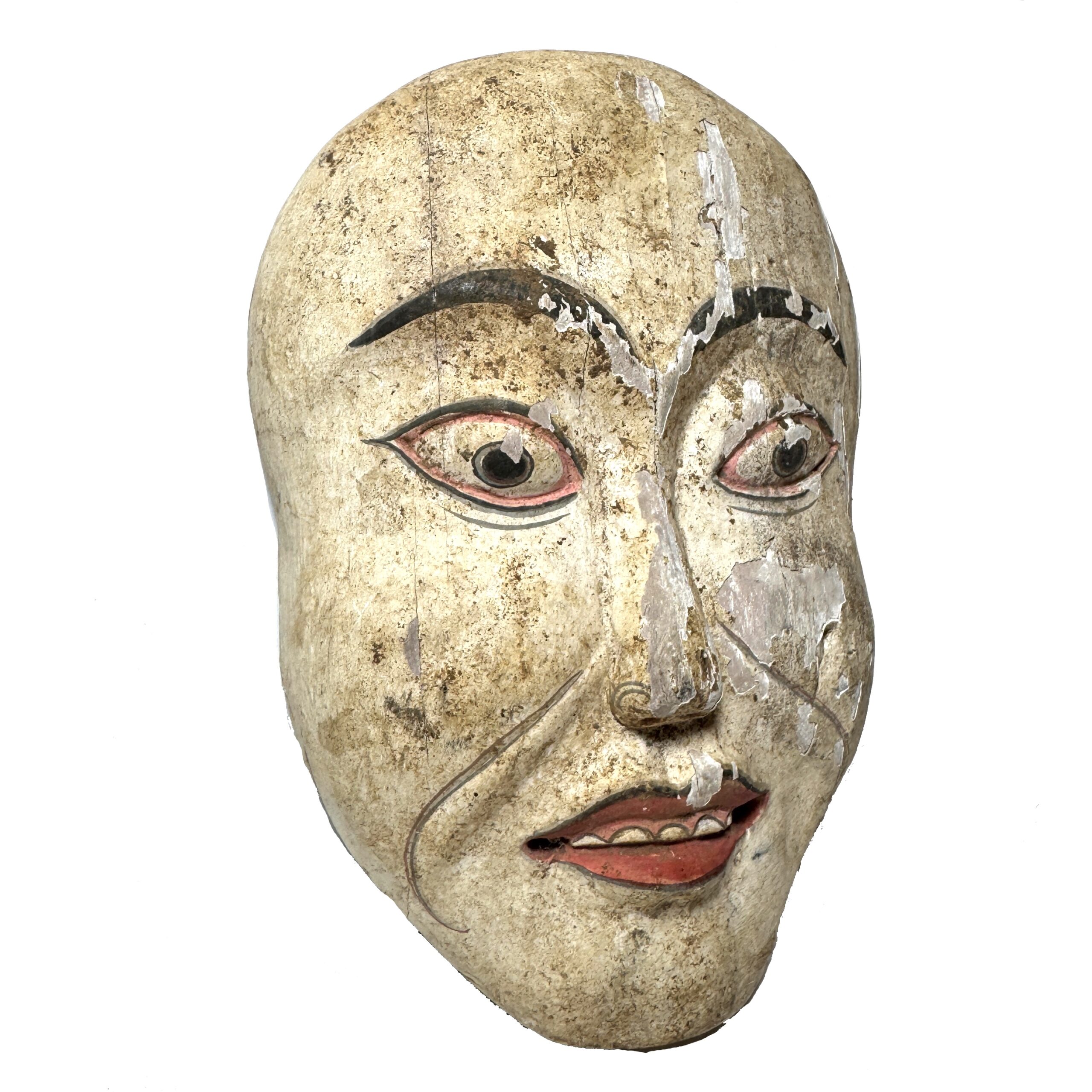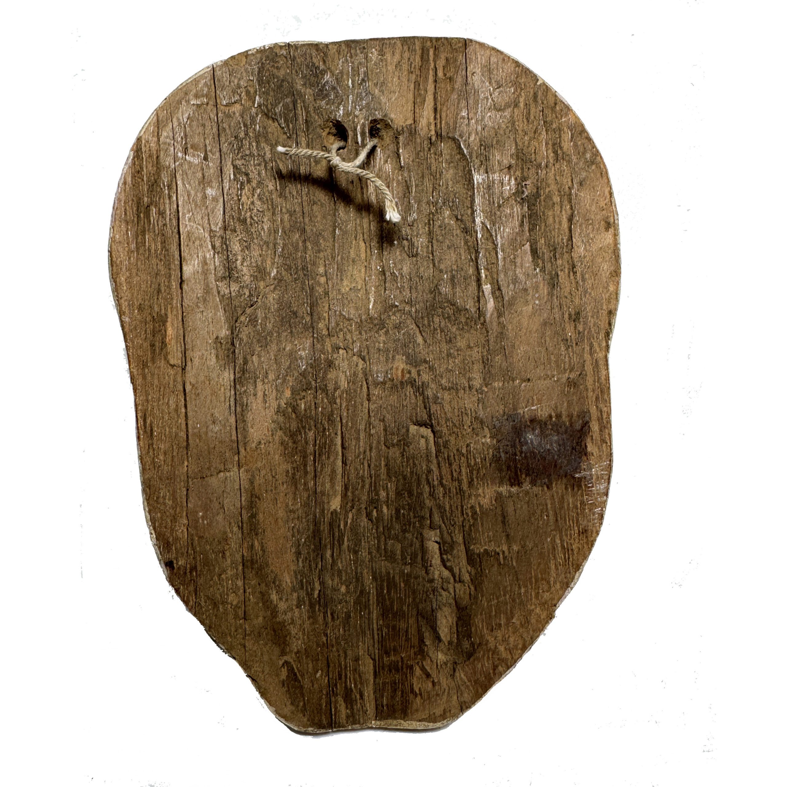 This elongated, oval, heavily weathered face is off white/cream with painted details of high black eyebrows and slightly open red lips outlined in black forming a subtle smile. Made from hardwood, the surface shows age, abrasions, pigment losses and cracks, especially around her left cheek and brow. Probably carved in Nusa it is a lovely rare rustic piece. Like those made in Bali, it was likely made for placement an a rice padi or rice field temple for the yearly celebration (every 210 days on the Balinese calendar) honoring Dewi Sri.