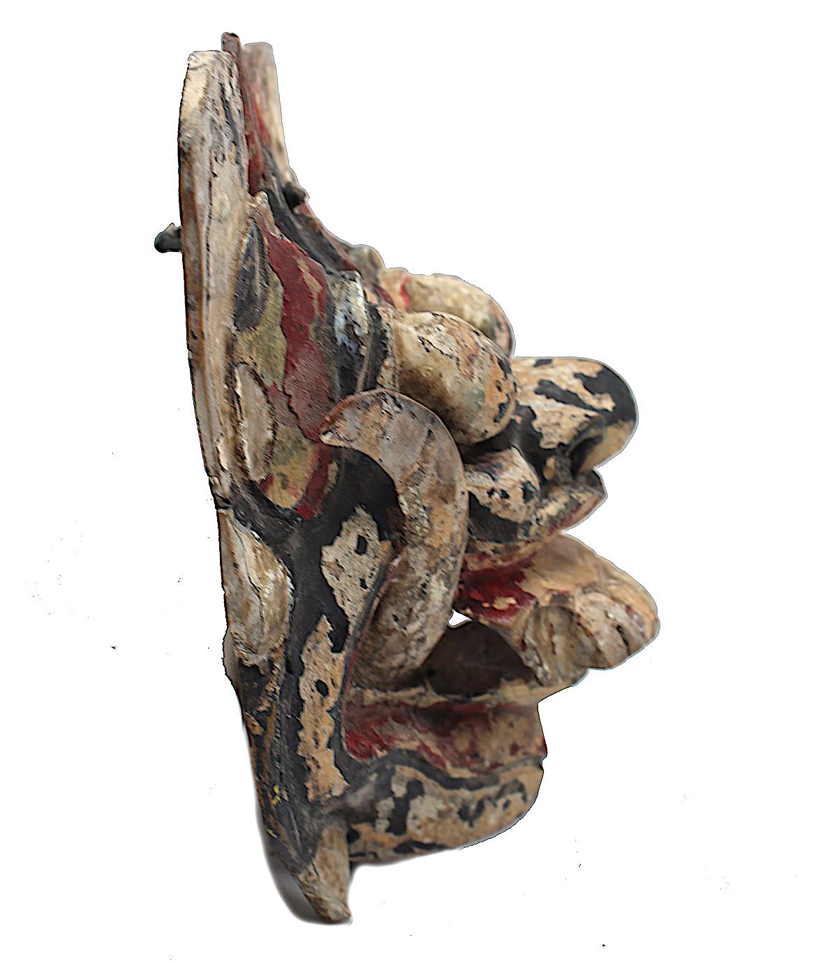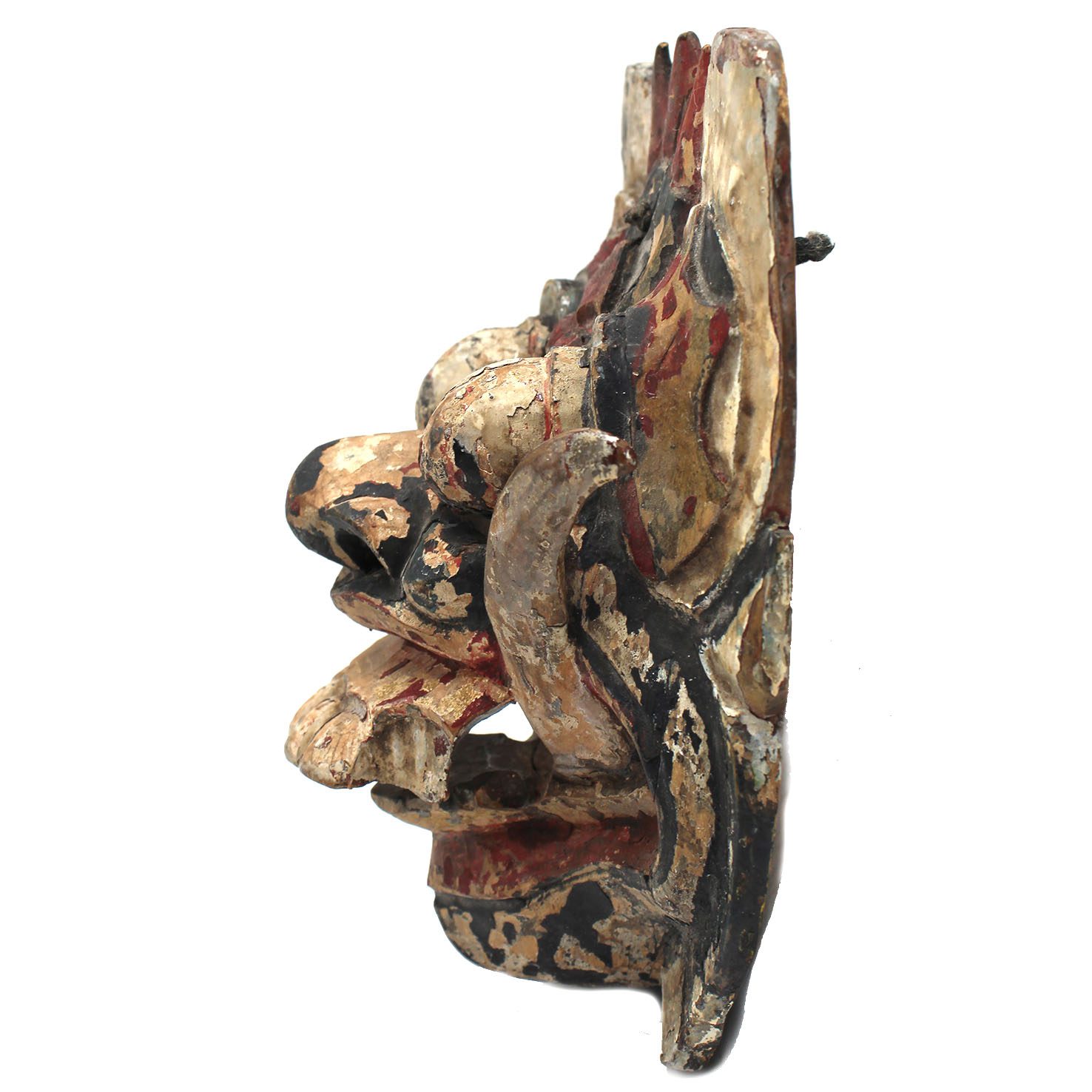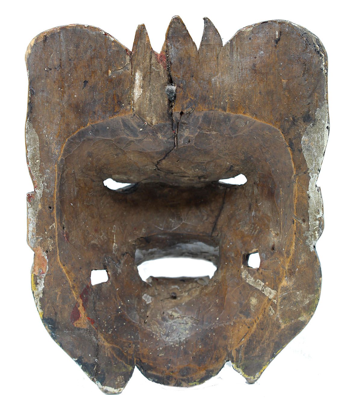 This vintage mask is in very good condition consistent with its years of age and use. It has expected paint losses, scratches, and scrapes and an aged patina with a crack at its center on the rear side. Our two antique Rangda masks are missing their lower fangs and account for them being “de-commissioned.”