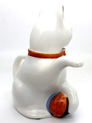 Beautifully hand-painted whimsical cat tea pot with red collar ribbon, ornamental bow, and ball under left paw. Black, orange, red and blue accents on face, ears, head, paws and ball. Bottom double stamped seal.