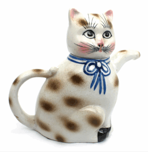 Rotund porcelain teapot with removable head. With her pink highlights, round wide eyes, feathered brows and 3 part ribbon with bow she appears to be an affectionate female lap cat.