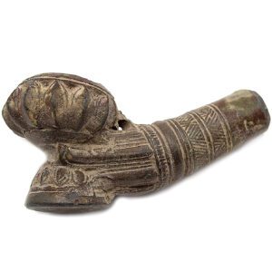 Mold made with intricate designs, clay earthen ware tobacco/opium pipes were woven into Burmese and Thai Hill Tribe social and cultural traditions. This is a unique gift a pipe smoker, although for decorative purposes only.