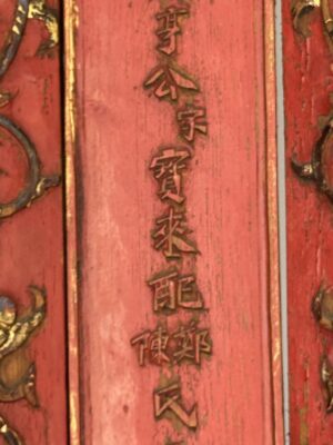 Red lacquered Ancestral Memorial Tablet with raised gold-gilded characters signifying the ancestor’s prosperity and high status These tablets are considered the home in which the ancestor’s spirit reside. The characters identify the ancestor, his two wives, and designates the tablet as a location where spirits are invited to reside and receive offerings from their descendants. Topped with a scalloped oval panel with the Three Stars Gods Fu, Lu and Shou on celestial clouds.