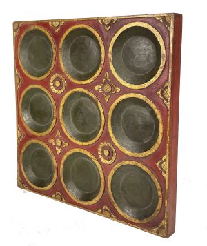 This intricately hand carved gold and silver platter with indentations on both sides was used to make confections called sweetmeats eaten at festivals, holidays, and other key celebrations. The round molds symbolize the moon and cohesion of the family. The 5-petal plum blossoms attached to vines symbolize purity and endurance, as well as the coming of spring, renewal, and longevity. The multiple seeds are a wish for fertility and sons, and thus this mold may have been a holiday and/or marriage gift to a young couple.