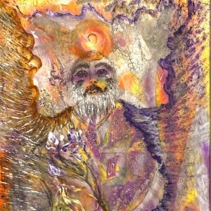 This striking painting is an homage to Soviet Armenian film director Sergei Parajanov, one of the great filmmakers of the 20th century. Here Anush’s spiritualized representation depicts his virtuous life, with angel wings ascending to the heavens in an aura bathed in glowing light.