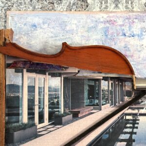 This vibrant collage was inspired by a European concert Lark Pilinsky attended with her husband, where the violin player smashed his instrument on the stage, possibly imitating Pete Townsend, lead Guitarist for The Who. This work draws directly from her love of these elevated musical experiences.