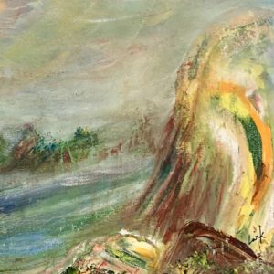 This dynamic painting is part of Lark Pilinsky’s Portal Series in which a portal represents an escape from the often grueling routine and challenges of everyday life into an uplifting spiritual realm. The passage is a solitary unexpected experience that “interrupts the rules of everyday life and keeps us guessing at what exciting event will be next.”