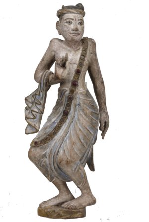 This exquisite teak carving of a Mandalay Burmese male dancer wearing a sarong is in a fluid twisted pose emphasizing his strength, balance and grace with his raised hand is in a position similar to a Buddhist mudra. His humble status is reflected his head scarf and a bejeweled sarong with insert glass that reflect light and add movement and depth. His joyful beautiful face stares with open eyes and slightly parted lips It is simply a gorgeous work mounted on a contemporary frosted stand to complement any setting.