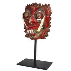 Dance mask of Rangda, sacred Balinese demon-queen with 2 upper and lower fangs, scary teeth, jagged facial elements, menacing eyes, deep red. Featured in Spiderman 2002 movie on museum quality metal stand.