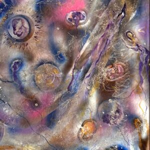 In this painting, angelic beings dance around a radiant core, merging with ethereal waves of gold, violet and stardust textures. The composition evokes a kind of celestial choreography—at once a celebration of divine presence and a meditation on spiritual illumination.