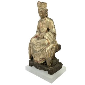 Nanhai Guanyin on Mount Putuo sits as a triad with acolytes Shan Tsai hands in prayer and the Dragon Princess offering the “illuminating pearl.” Very rare Ming sculpture on an Acrylic base is one of our favorites VA collection carvings.