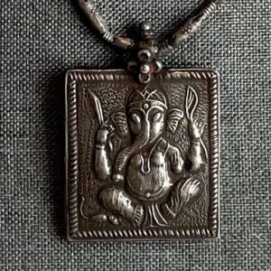 Indian silver embossed or repoussé Ganesh amulet pendant seated with 4 arms holding traditional items like an axe, a lotus, or sweets in a braided rope-like design border.