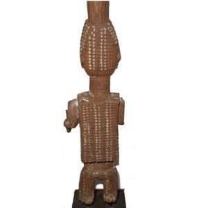 $3,600.00Original price was: $3,600.00.$2,750.00Current price is: $2,750.00.On Stand: H: 61″ W: 12″ | D: 12″ CALL 213-568-3030 OR EMAIL [email protected] FOR SHIPPING.Vintage wooden structural post Nigerian Yoruba warrior statue with a scale-pattern torso armor, elongated helmet, strong frontal posture and prominent expressive facial features symbolizing a warrior’s powers. Mounted on a black metal base.